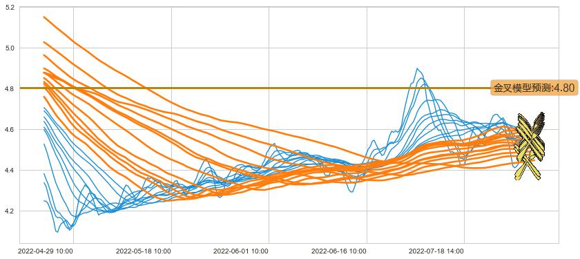 ➢ 120小时均线于(08-11 13:00: 4.53)形成【金叉】基于【金叉历史模型】预测金叉后最高波峰价格: 4.83, 金叉后最高价格4.67,尚未达到预测最高波峰价格, 预期继续上涨