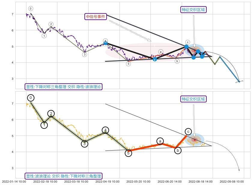➢ 下降对称三角整理属【中级别信号事件】波浪理论属【长级别信号事件】中长周期组合信号事件,中长事件长度比62.67%