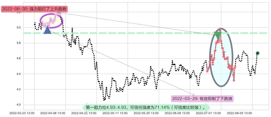 ♘ 阻力价格位4.93,可信任强度71.14%,距离最后交易2022-08-12 14:00形成的收盘价格4.67相差 +5.52%