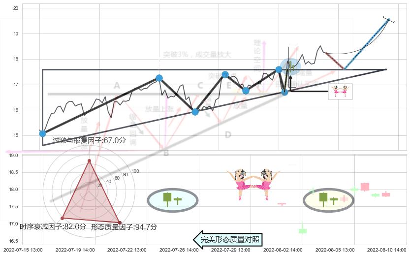 从2022-04-27 09:00至2022-08-12 14:00,共包含248个小时,阶段股价上涨31.76%,阶段股价变动位移路程比: 1 : 7,上涨趋势角度: 36.5,2022-08-03 13:00向⇪形成缺口,跳空上涨+7.18%