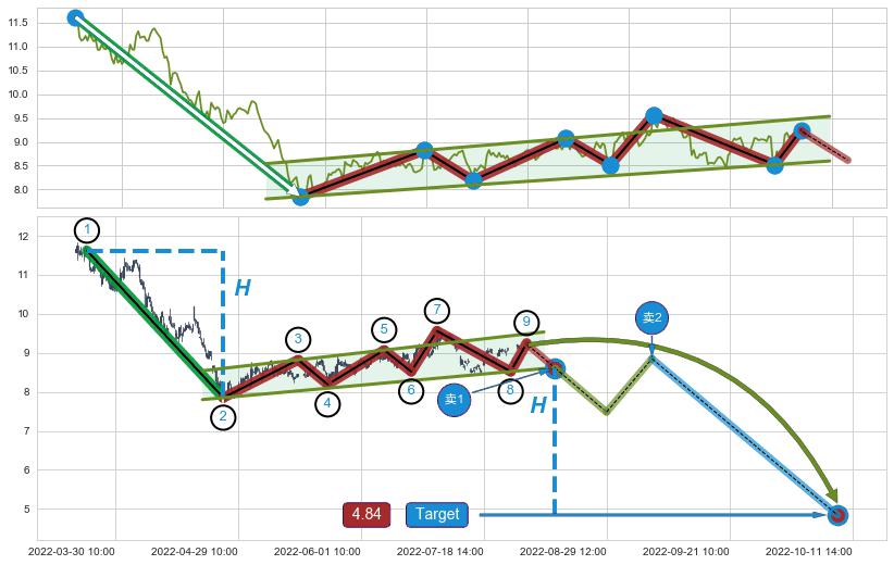 ➣ 升旗形:猜想临近关键支撑位突破点 → 临近拐点下跌 → 风险信号 → 大趋势均值回复