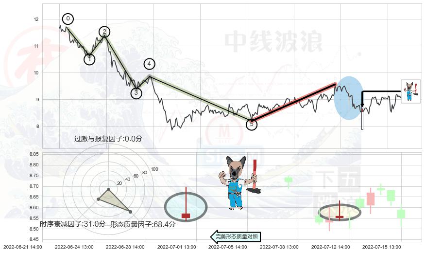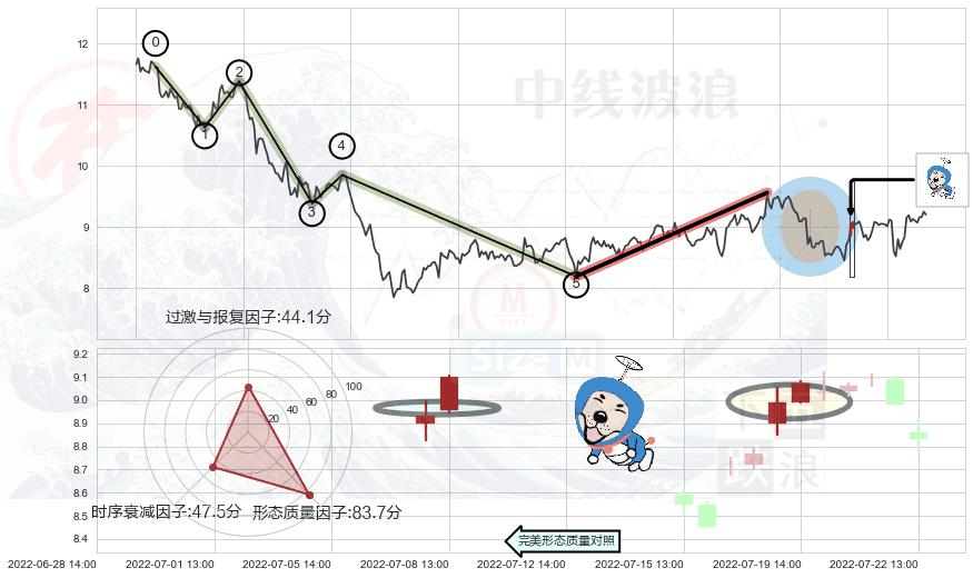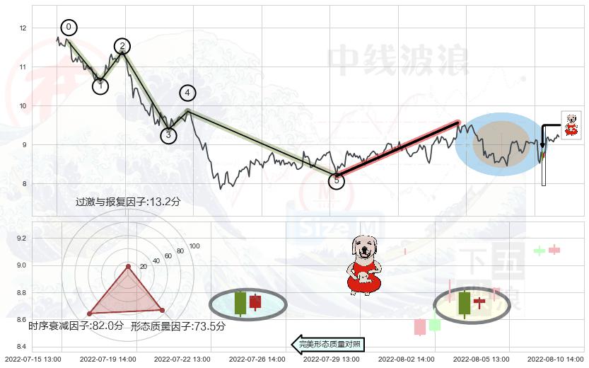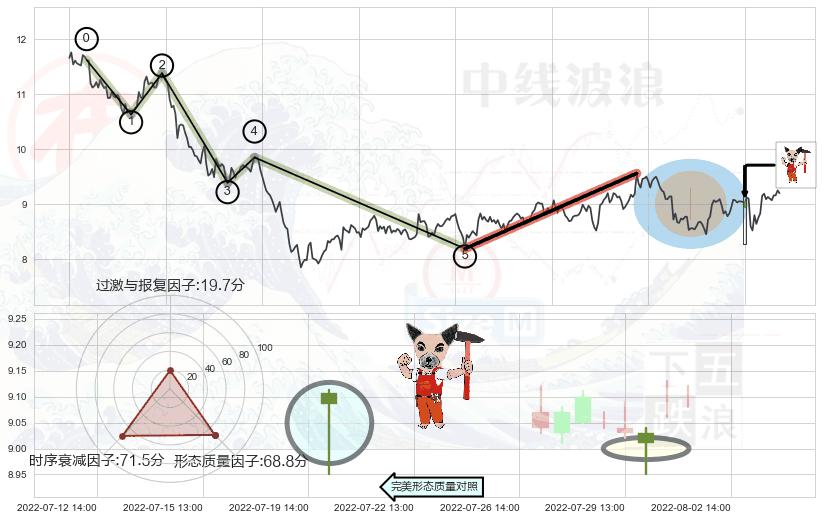 从2022-07-15 14:00至2022-08-12 14:00,共包含39个小时,阶段股价上涨8.98%,阶段股价变动位移路程比: 1 : 4