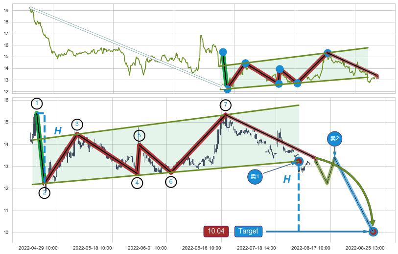 从2022-06-02 09:00至2022-07-15 14:00,共包含95个小时,阶段股价上涨5.54%,阶段股价变动位移路程比: 1 : 14