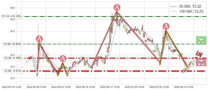 ♘ 阻力价格位13.95,可信任强度47.03%,距离最后交易2022-08-12 14:00形成的收盘价格13.38相差 +4.29%