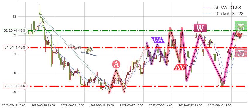 ♘ 阻力价格位32.25,可信任强度60.31%,距离最后交易2022-08-12 14:00形成的收盘价格31.79相差 +1.43%