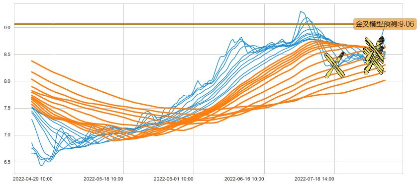 ➣ 45小时均线于(08-05 14:00: 8.41)形成【金叉】基于【金叉历史模型】预测金叉后最高波峰价格: 8.97, 金叉后最高价格9.12,虽然已经到达预测最高波峰价格,但耗时间很短动能很强, 预期继续上涨