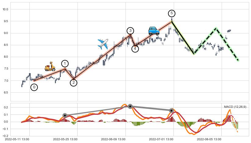 ➣ 波浪理论:猜想达到c点后小反弹终止反转下跌 → 下跌 → 【拐点】临近 → 阶段均值回复结束后继续大周期趋势跟踪