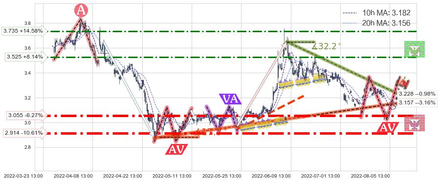 ♘ 阻力价格位3.735,可信任强度56.45%,距离最后交易2022-08-12 14:00形成的收盘价格3.260相差 +14.58%