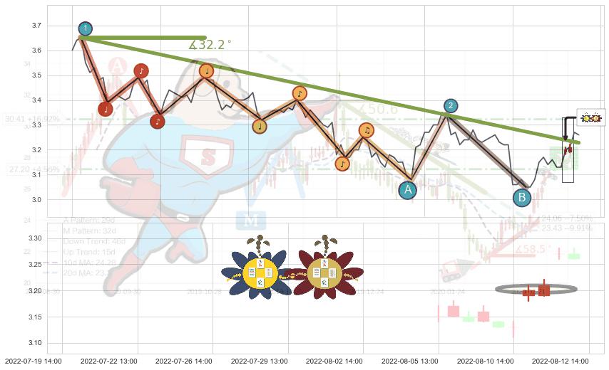 ♘ 阻力价格位3.525,可信任强度68.93%,距离最后交易2022-08-12 14:00形成的收盘价格3.260相差 +8.14%