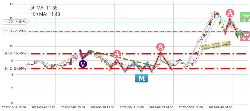 ♘ 阻力价格位11.72,可信任强度49.54%,距离最后交易2022-08-12 14:00形成的收盘价格11.21相差 +4.54%