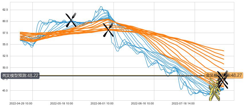 ➣ 10小时均线于(08-11 14:00: 47.73)形成【死叉】基于【死叉历史模型】预测死叉后最低波谷价格: 46.06, 死叉后最低价格46.34,尚未达到预测最低波谷价格, 预期继续下跌
