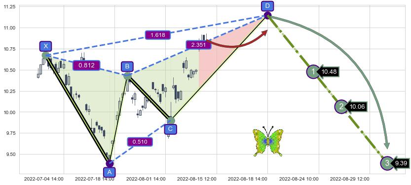 ➣ 未完成【蝴蝶】形态起点X: 06-29:13, 已到达C点: 08-02:14, 预测最终D点: 08-18:14, 共85交易小时