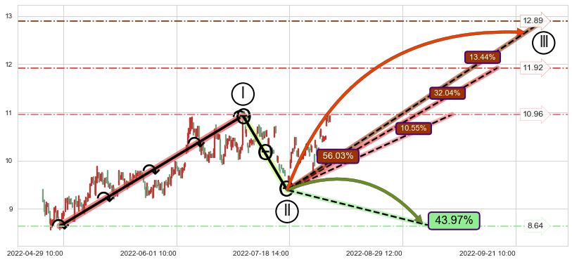 ♘ 支撑价格位9.97,可信任强度89.48%,距离最后交易2022-08-12 14:00形成的收盘价格10.85相差 -8.15%