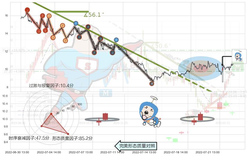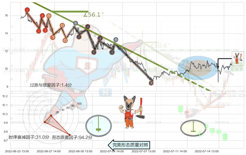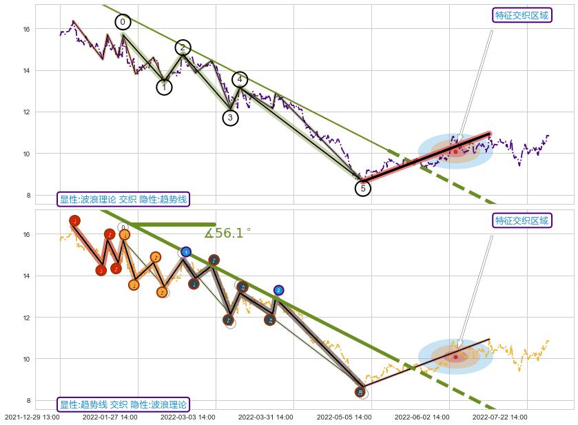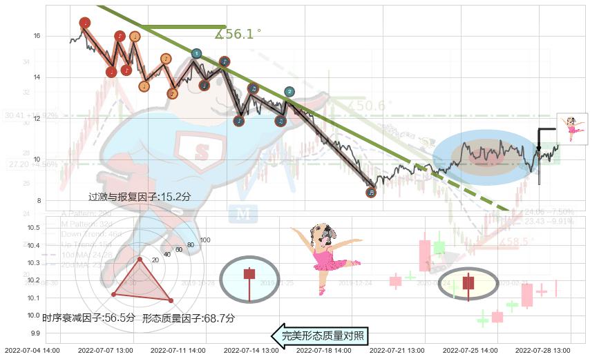 从2022-04-28 13:00至2022-07-15 13:00,共包含201个小时,阶段股价上涨11.30%,阶段股价变动位移路程比: 1 : 16,上涨趋势角度: 45.1