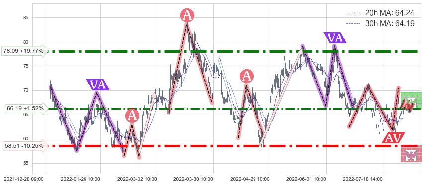 ♘ 阻力价格位66.19,可信任强度66.58%,距离最后交易2022-08-12 14:00形成的收盘价格65.20相差 +1.52%