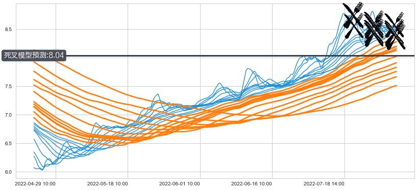 ➣ 45小时均线于(08-01 14:00: 8.40)形成【死叉】基于【死叉历史模型】预测死叉后最低波谷价格: 7.85, 死叉后最低价格8.17,尚未达到预测最低波谷价格, 预期继续下跌