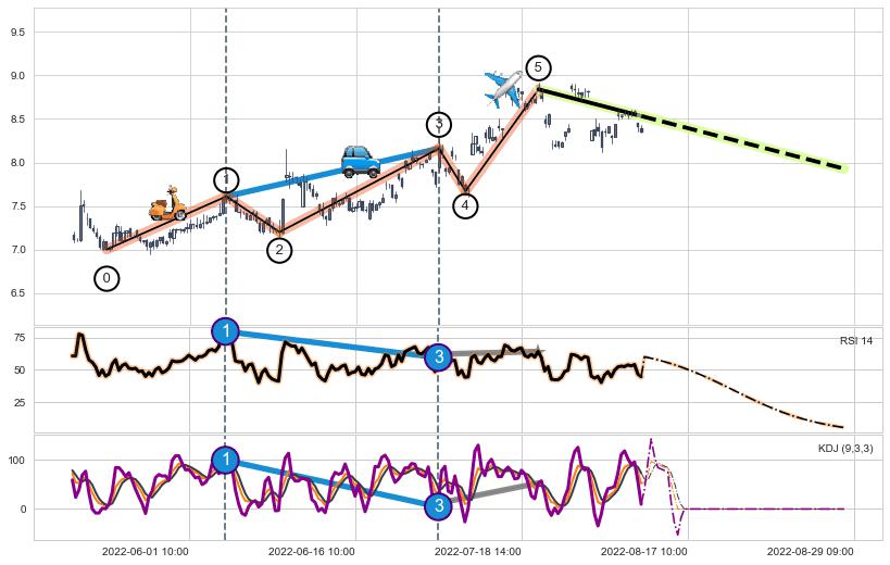 ➣ 吊颈线(上吊线) + 波浪理论上涨浪:浪5回调拐点信号叠加后【反向回撤率】低,【看空】信号叠加【存续影响大】
