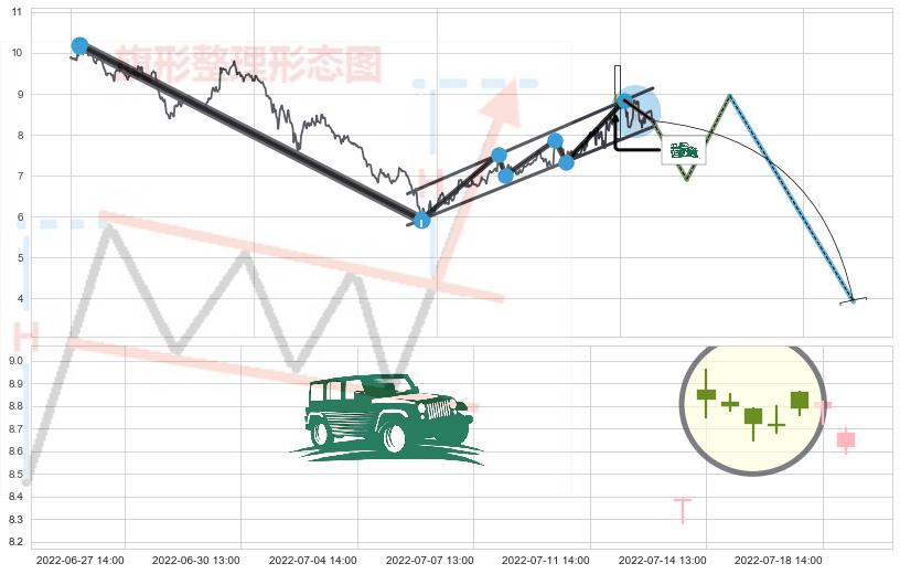 ➣ 收盘价(07-22:13: 8.44 )→回踩→第一根k线高点(07-20:14: 8.77 )