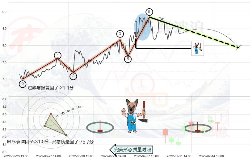➢ 🕰 价格走势在2022-07-14 13:00:00至2022-07-18 13:00:00期间形成高档五阴线,残存影响值:-2.93