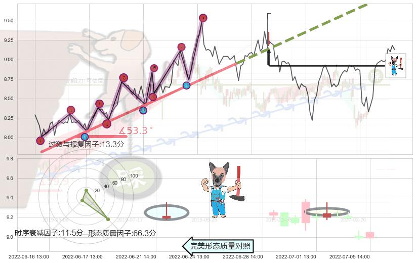 ➣ 2022-05-24 14:00-2022-06-22 13:00上升趋势存在反转[风险],其原上升趋势的支撑位(9.87)已破位[强阻力信号],原上升趋势角度: 53.3˚