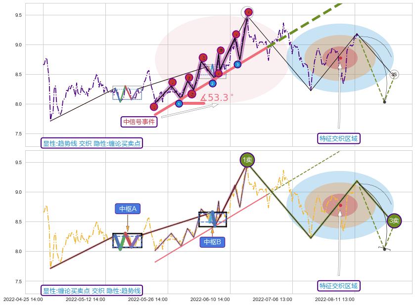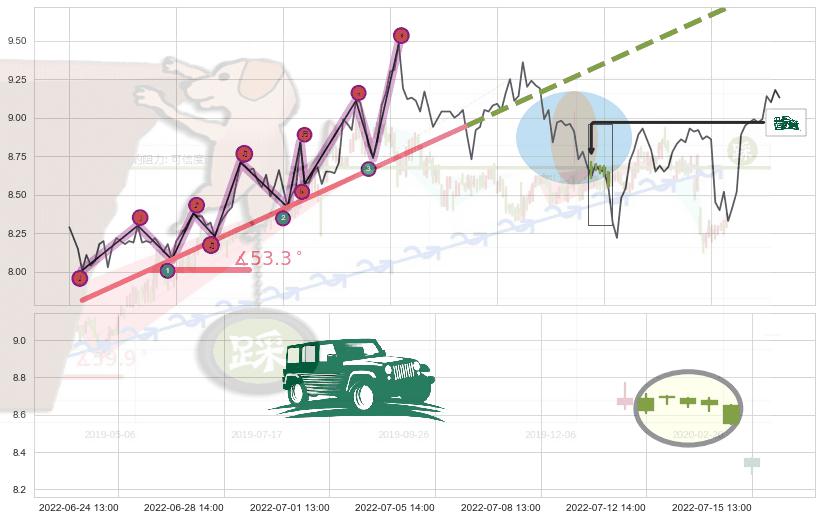 从2022-05-24 14:00至2022-06-22 13:00,共包含91个小时,阶段股价上涨10.93%,阶段股价变动位移路程比: 1 : 7,上涨趋势角度: 53.3