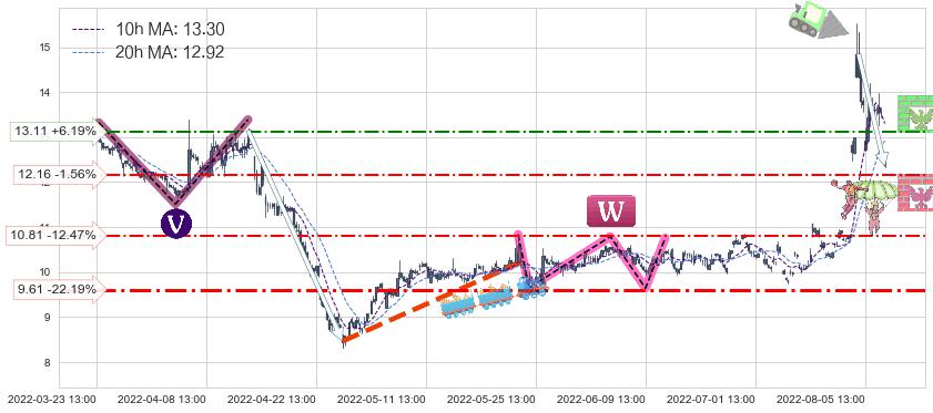♘ 阻力价格位13.11,可信任强度48.68%,距离最后交易2022-08-12 14:00形成的收盘价格12.35相差 +6.19%