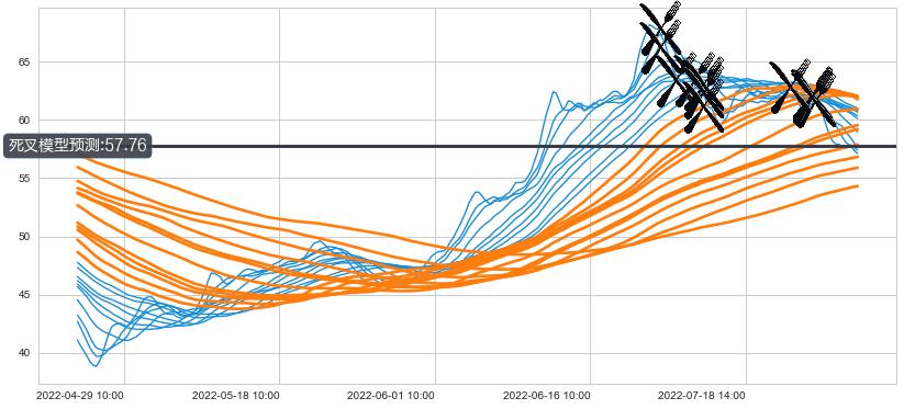 ➢ 55小时均线于(07-07 14:00: 62.94)形成【死叉】基于【死叉历史模型】预测死叉后最低波谷价格: 57.14, 死叉后最低价格56.10,已经下跌超出预测最低波谷价格, 预期反弹