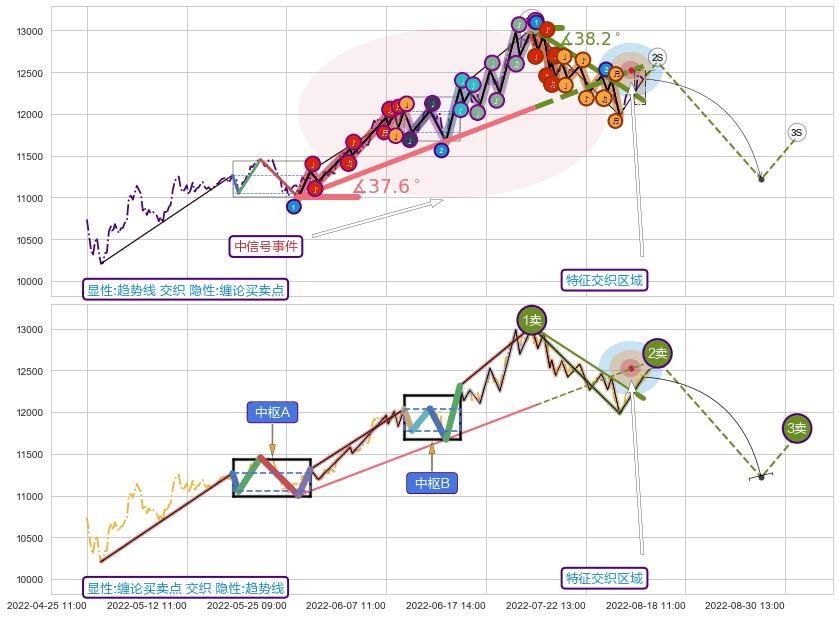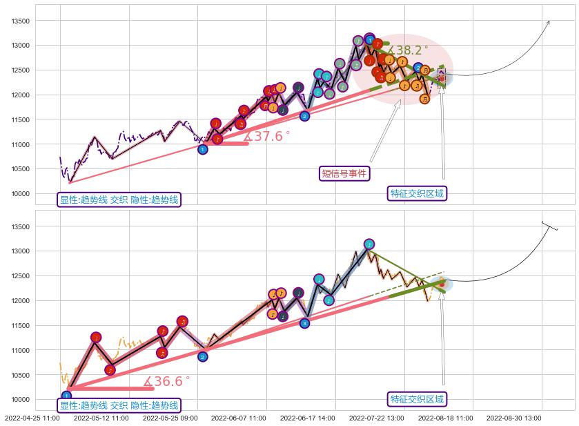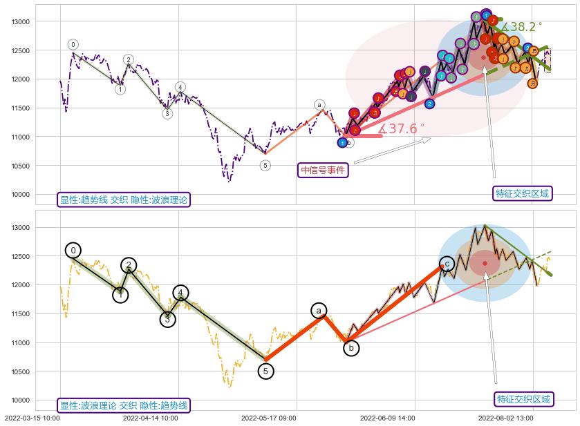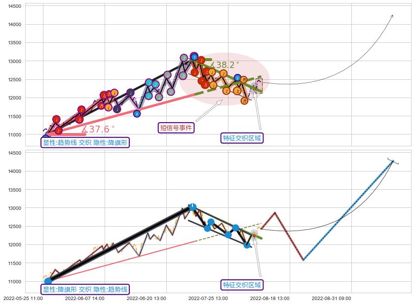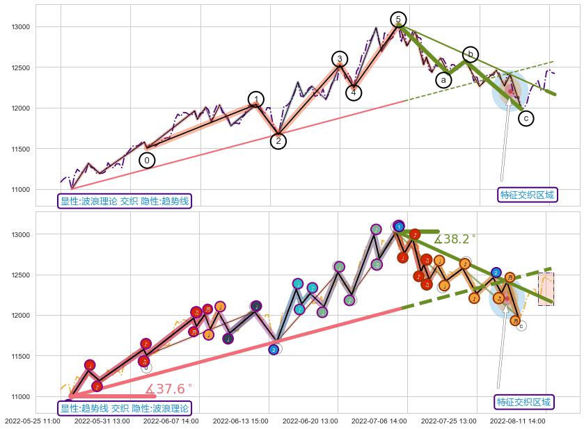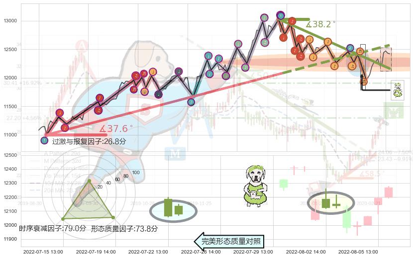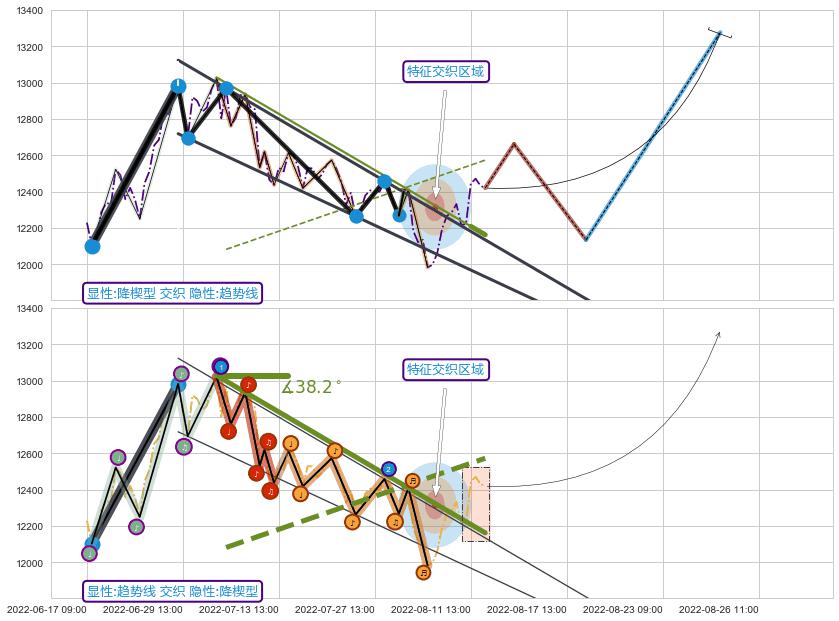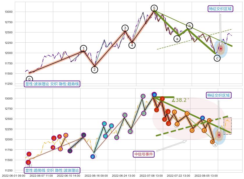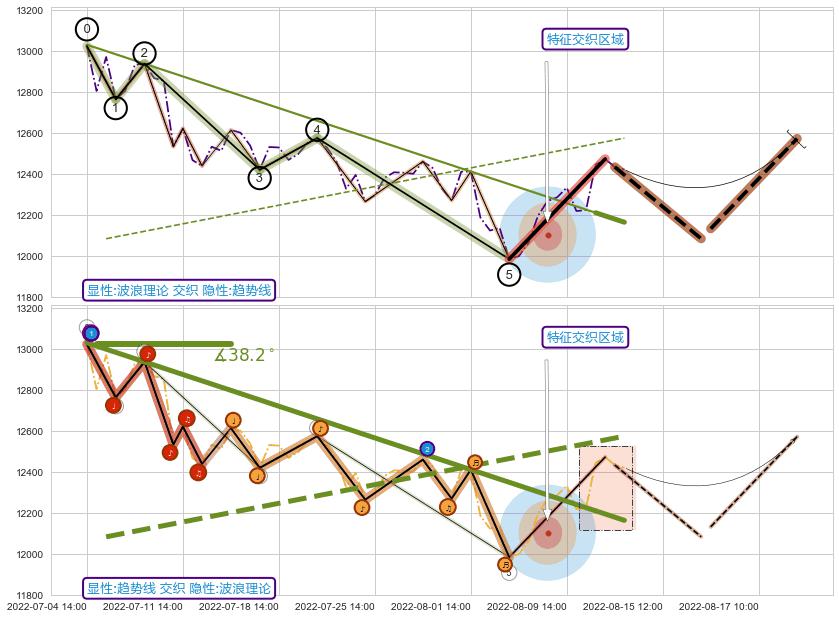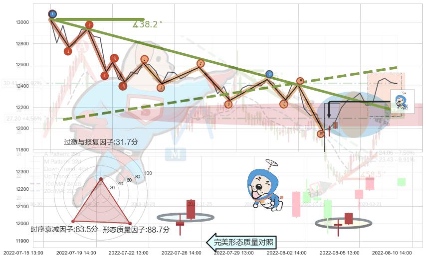 ➢ 2022-07-04 14:00-2022-08-11 13:00下跌趋势存在反转上涨[机会],其原下跌趋势的阻力位(12162.52)已被突破[强支撑信号],原下跌趋势角度: 38.2˚