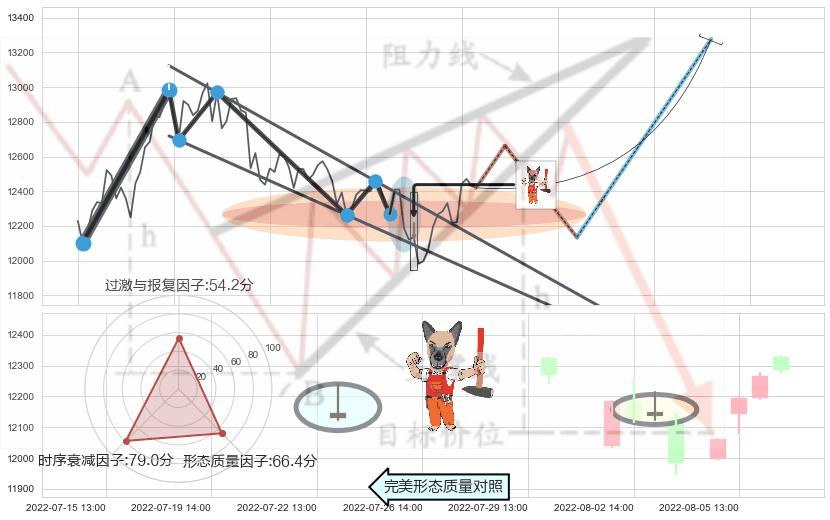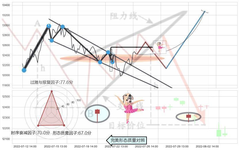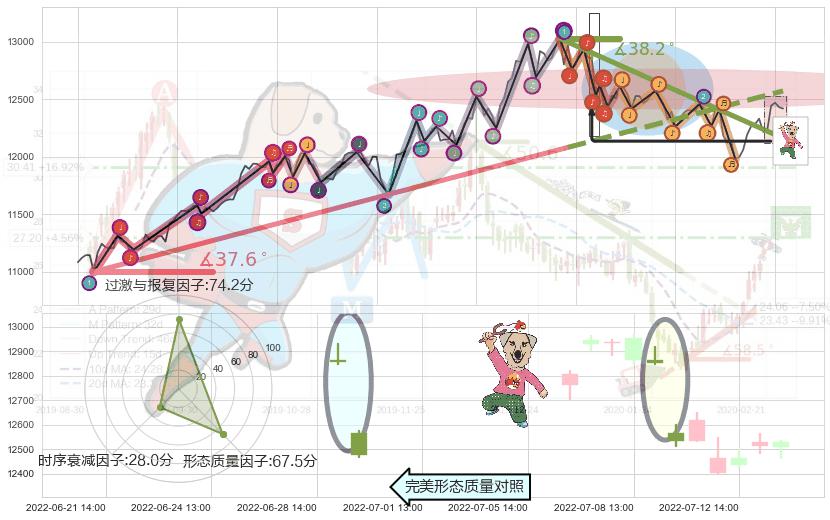 ➢ 2022-05-26 09:00-2022-07-05 14:00上升趋势存在反转[风险],虽然原上升趋势的支撑位(12573.20)已破位,但其支撑效果尚存,原上升趋势角度: 37.6˚