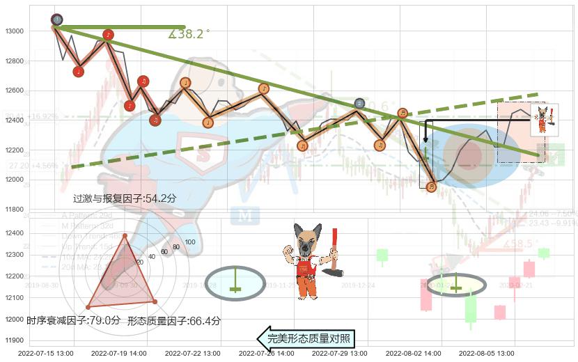 从2022-07-06 13:00至2022-08-11 13:00,共包含51个小时,阶段股价下跌-2.38%,阶段股价变动位移路程比: 1 : 12,下跌趋势角度: 38.2