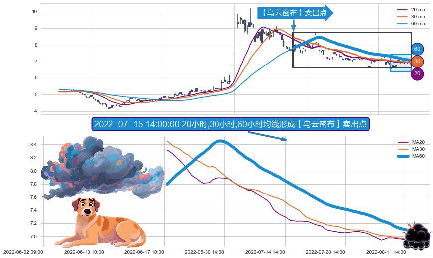 形态多维评估: ⚀ 2022-06-17 11:00:00小时-2022-08-12 14:00:00小时显现 20小时-30小时-60小时均线 【乌云密布】卖出点 看空信号,后市看跌,卖出