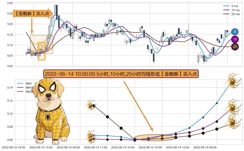 形态多维评估: ⚀ 2022-06-14 10:00:00小时显现 5小时-10小时-20小时均线 【金蜘蛛】买入点 看多信号,后市看涨,买入