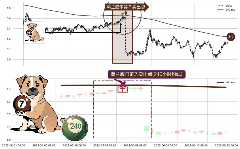 形态多维评估: ⚀ 2022-06-07 10:00:00-小时显现 葛兰威尔均线 240小时均线 第⑦卖出点 下降趋势的中继信号,后市看跌,卖出信号