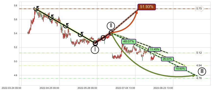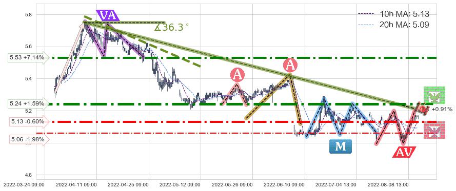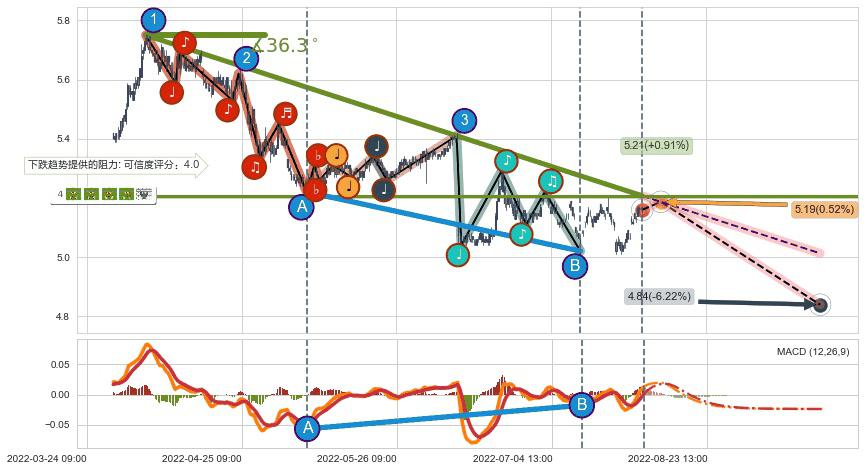 ♘ 阻力价格位5.24,可信任强度91.42%,距离最后交易2022-08-12 14:00形成的收盘价格5.16相差 +1.59%