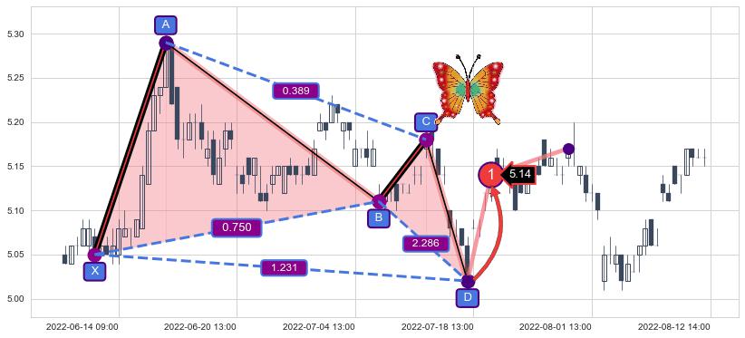 ➣ 已完成【蝴蝶】形态起点X: 06-13:10, 终点D: 07-15:14, 共64交易小时
