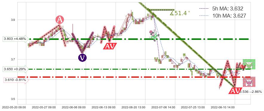 ♘ 阻力价格位3.650,可信任强度55.55%,距离最后交易2022-08-12 14:00形成的收盘价格3.640相差 +0.29%