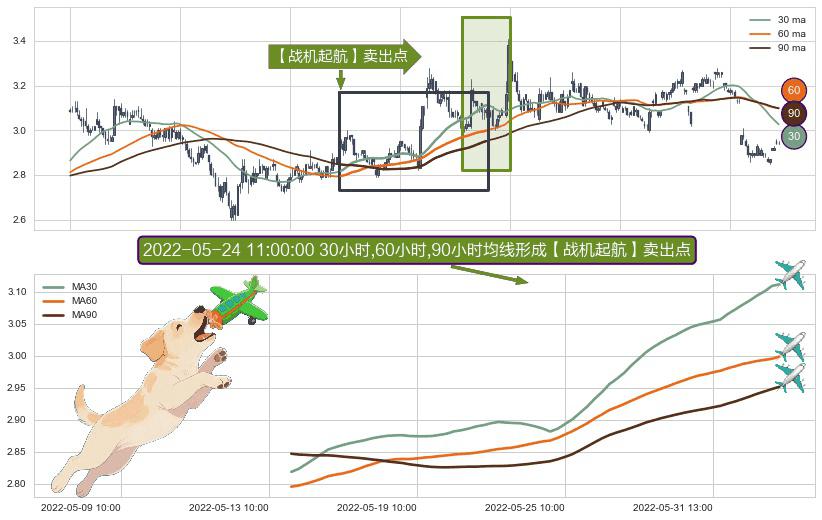 形态多维评估: ⚀ 2022-05-13 14:00:00小时-2022-06-02 11:00:00小时显现 30小时-60小时-90小时均线 【战机起航】卖出点 看空信号,后市看跌,卖出