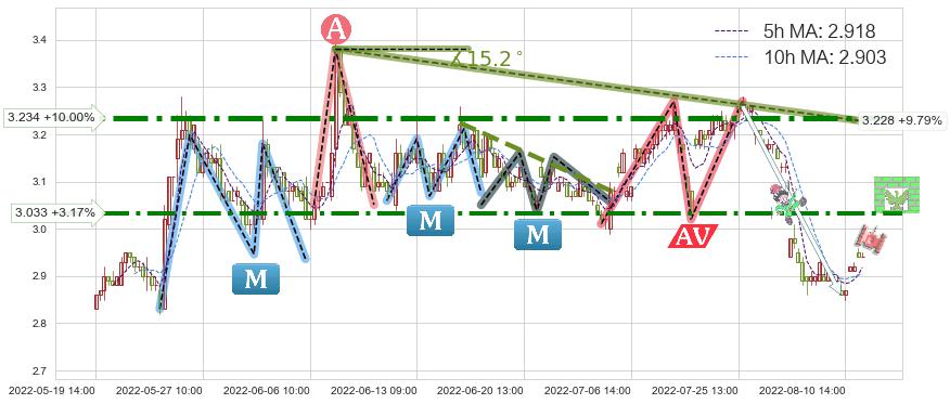 ♘ 阻力价格位3.033,可信任强度83.84%,距离最后交易2022-08-12 14:00形成的收盘价格2.940相差 +3.17%