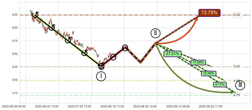 ➣ 预测:2022-08-24 11:00,【继续下探】稳定目前下跌趋势的前提下,预测价格:5.10