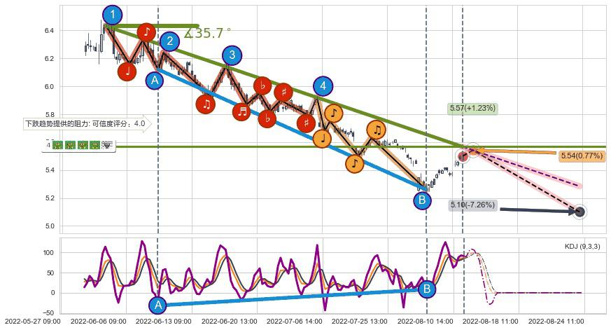 ♘ 阻力价格位6.09,可信任强度60.57%,距离最后交易2022-08-12 14:00形成的收盘价格5.50相差 +10.76%