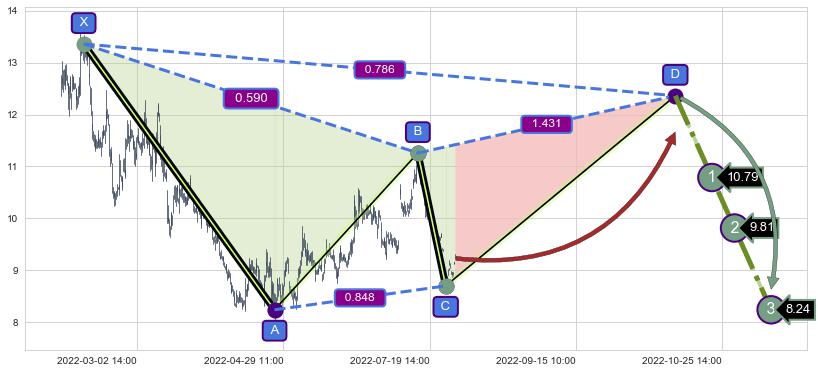 ➢ 距离预测D点位置有足够的上涨空间, 与看跌【伽利】形态相反,实际方向【看涨】