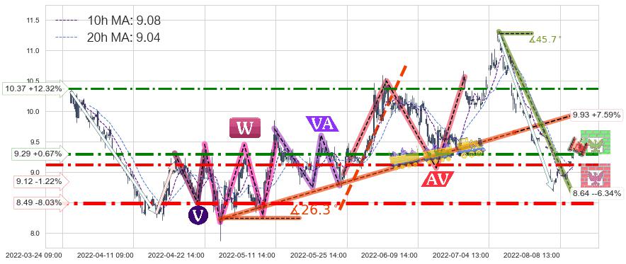 ♘ 支撑价格位9.12,可信任强度74.49%,距离最后交易2022-08-12 14:00形成的收盘价格9.23相差 -1.22%