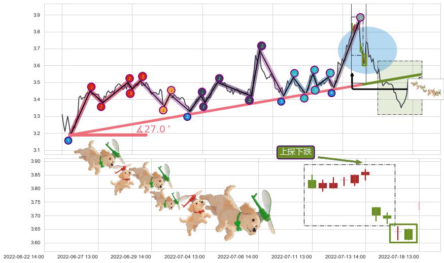 ➢ 最后的上涨趋势2022-04-26 14:00至2022-07-15 13:00:存在破位迹象,后续小调整或者反转下跌