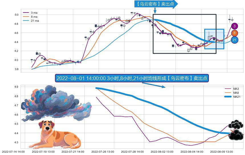 ⚀ 2022-07-22 14:00:00小时-2022-08-09 13:00:00小时显现 3小时-8小时-21小时均线 【乌云密布】卖出点 看空信号,后市看跌,卖出