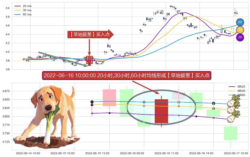 ⚀ 2022-06-16 10:00:00小时显现 20小时-30小时-60小时均线 【旱地拔葱】买入点 看多信号,后市看涨,买入