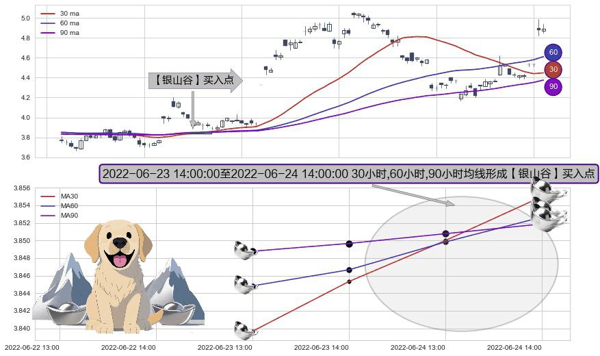 ⚀ 2022-06-24 13:00:00-小时至2022-06-24 14:00:00-小时显现 30小时-60小时-90小时均线 【银山谷】买入点 看多信号,后市看涨,买入