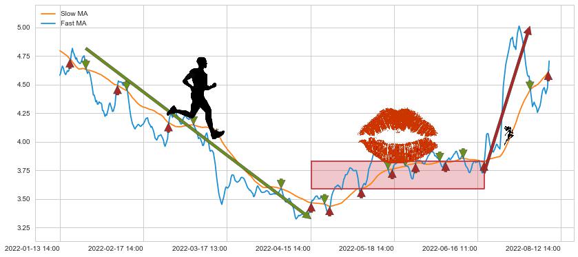 01-24 09:00至04-18 09:00 慢线与快线呈空头排列, 慢线与快线接触少,无缠绕