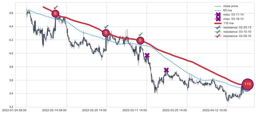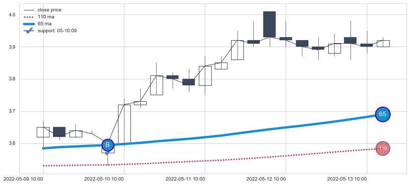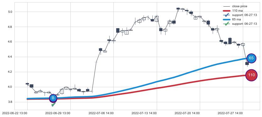 ⚂ 2022-06-14 10:00:00-小时均线向下破位,2022-06-17 14:00:00-小时重新上穿突破均线,均线支撑再次生效