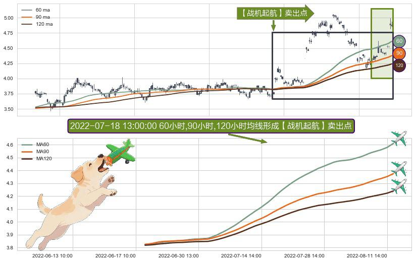 ⚀ 2022-06-17 14:00:00小时-2022-08-12 14:00:00小时显现 60小时-90小时-120小时均线 【战机起航】卖出点 看空信号,后市看跌,卖出