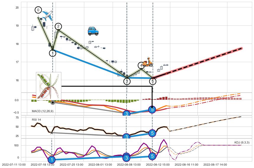 ➢ 1,3,5驱动浪MACD, RSI, KDJ走势都出现【常规背离】反转信号增强